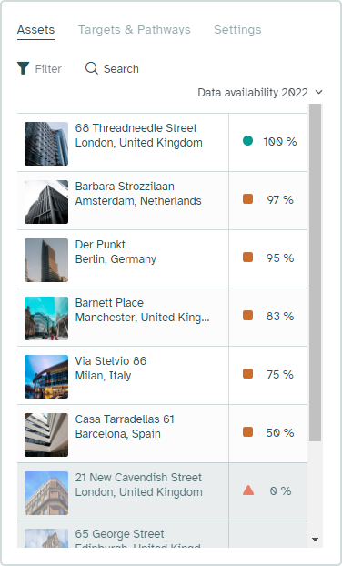 Your Net Zero Carbon Assets list displays your assets alongside a data coverage percentage based on the quality of the available data. This data is essential data for your Net Zero Carbon model.