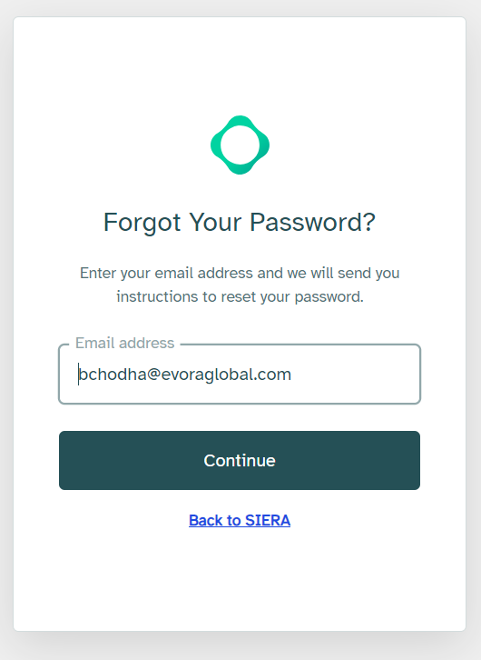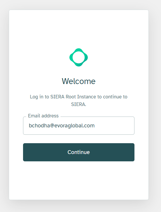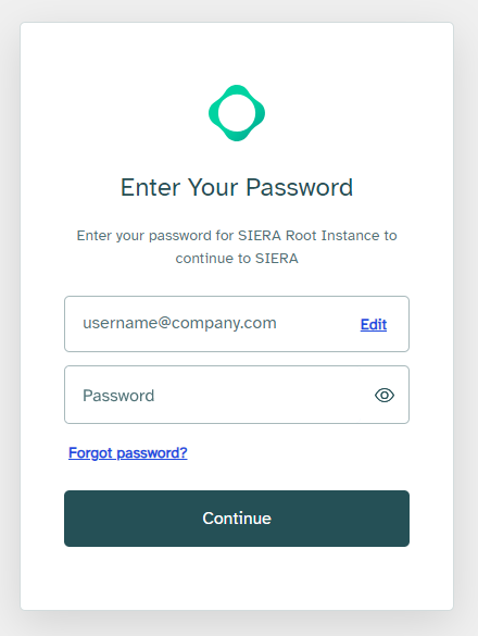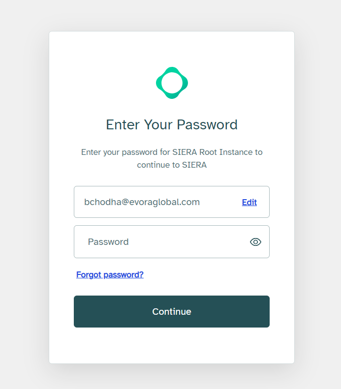 1. Open your SIERA log in URL (web page). Your email address will be auto-completed. Click on the Continue button.