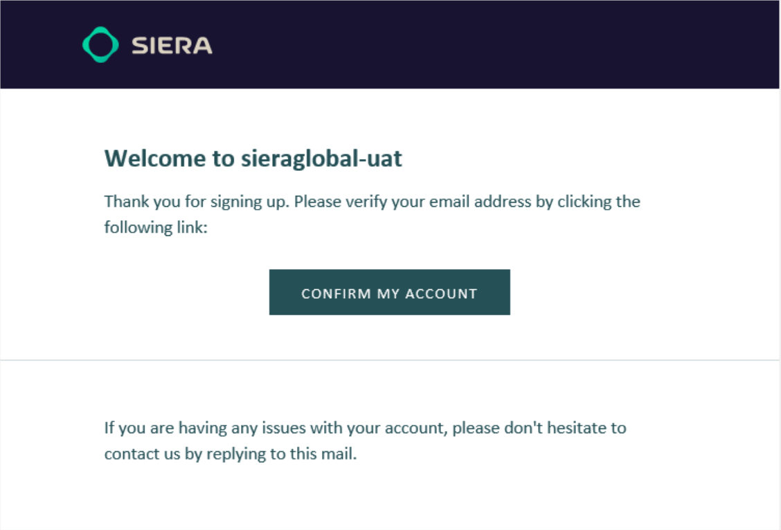 3. Keep an eye on your Email Inbox for your Welcome to SIERA confirmation, prompting you to verify your SIERA account. Click on the Confirm My Account button.